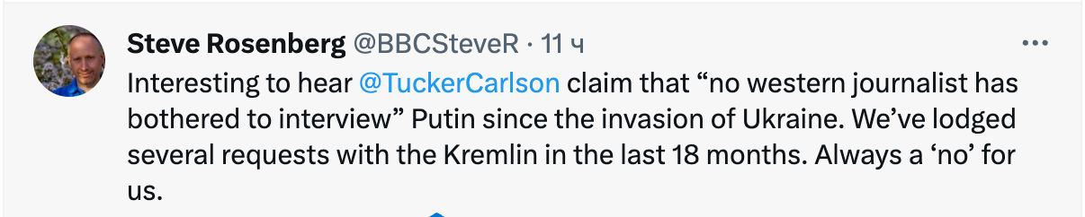 "Интересно слышать от Такера Карлсона, что "ни один западный журналист не побеспокоился о том, чтобы взять интервью" у Путина, после того как российские войска вошли на Украину. За последние полтора года мы отправили Кремлю несколько запросов. Нам всегда — "нет", - пишет Стив Розенберг из ВВС.