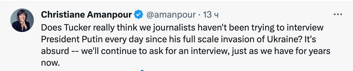 "Такер действительно считает, что мы, журналисты, не пытались взять интервью у президента Путина каждый день с момента начала его полномасштабного вторжения на Украину? Это абсурд… Мы продолжим запрашивать интервью, как делали это уже не один год", - заявила Кристиан Аманпур из CNN.