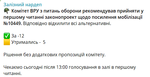 Парламентский комитет по обороне рекомендовал принять в первом чтении правительственный законопроект о мобилизации. И, соответственно, отклонить все альтернативные.