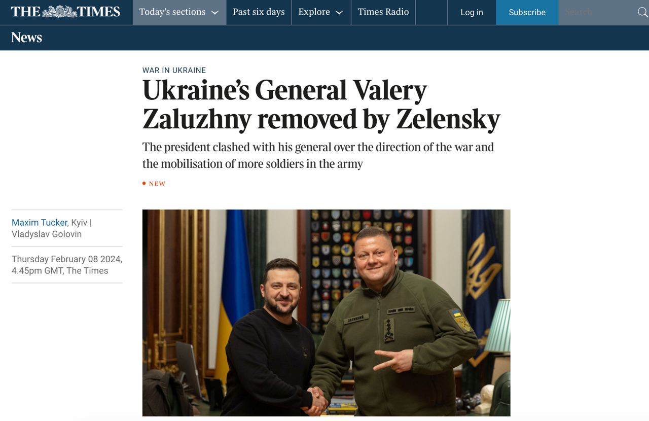 Военные источники рассказали The Times, что Зеленский впервые попросил Залужного уйти в отставку 29 января, но тот отказался. Тогда Зеленский заявил, что подпишет указ о его увольнении, но после утечки информации отказался от этого решения.