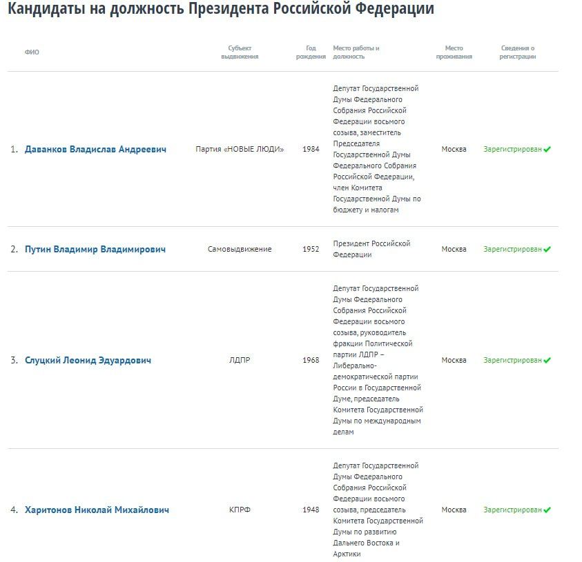 Центральная избирательная комиссия РФ объявила итоговый список из четырех кандидатов на выборах президента РФ.