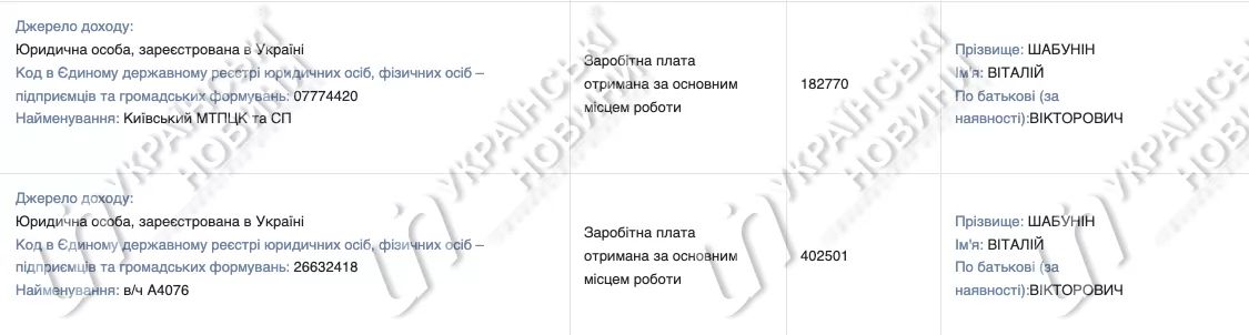 Также Шабунин во время войны получил 402 501 гривен зарплаты в воинской части А4076.