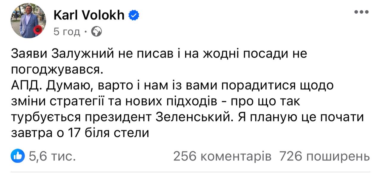"Заявления Залужный не писал и ни на какие должности не соглашался. Думаю, стоит и нам с вами посоветоваться по поводу изменения стратегии и новых подходов – о чем так беспокоится президент Зеленский. Я планирую это начать завтра в 17 возле стелы", - написал блогер.
