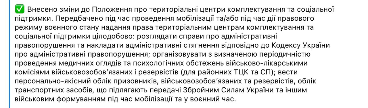 Теперь положение предусматривает, что во время проведения мобилизации и/или во время действия правового режима военного положения ТЦК дается право круглосуточно выполнять определенные действия: