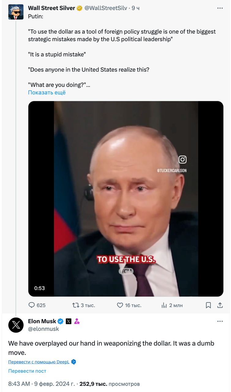 "Мы перестарались с превращением доллара в оружие. Это был глупый шаг", - согласился с главой Кремля Маск.