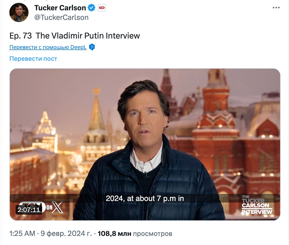 Между тем интервью Путина набрало в Х уже более 108 миллионов просмотров.