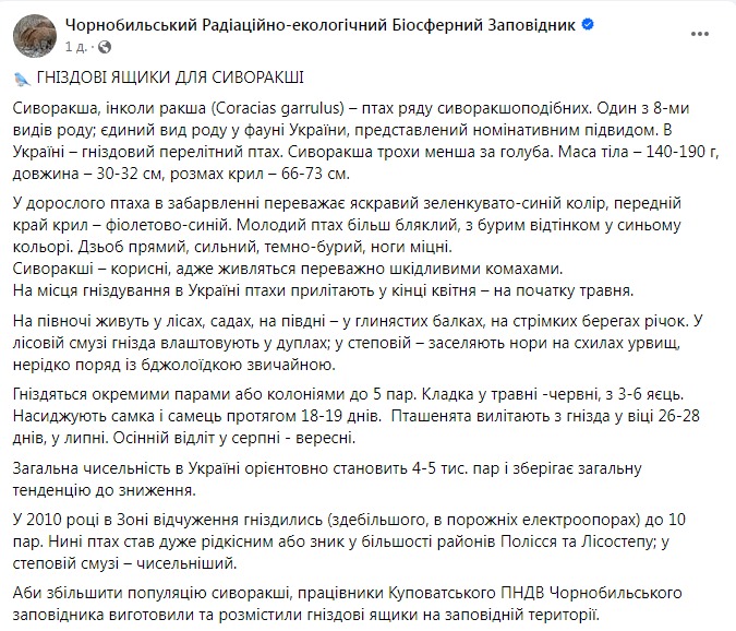 Чернобыльский радиационно-экологический биосферный заповедник сообщил, что сотрудники Куповатского природоохранного научно-исследовательского отделения изготовили и разместили в зоне отчуждения скворечники для сизоворонки.