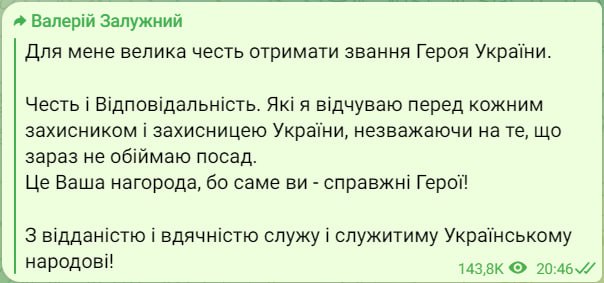 В сообщении в своем телеграм-канале Залужный назвал большой честью присвоение ему звания Героя Украины. При этом экс-главком не упомянул президента Владимира Зеленского, который издал соответствующий указ.
