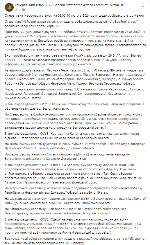 За прошедшие сутки между ВСУ и российскими военными произошло 111 боевых столкновений. При этом россияне нанесли 73 авиационных удара, совершили 76 обстрелов из реактивных систем залпового огня по позициям наших войск и населенным пунктам.