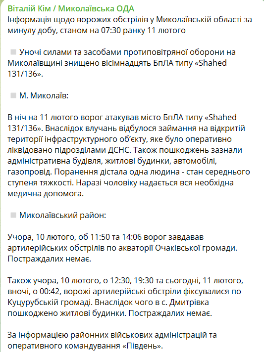 • в Николаеве дрон попал по объекту инфраструктуры, повреждено админздание, автомобили, жилые дома и газопровод. Ранен один человек.