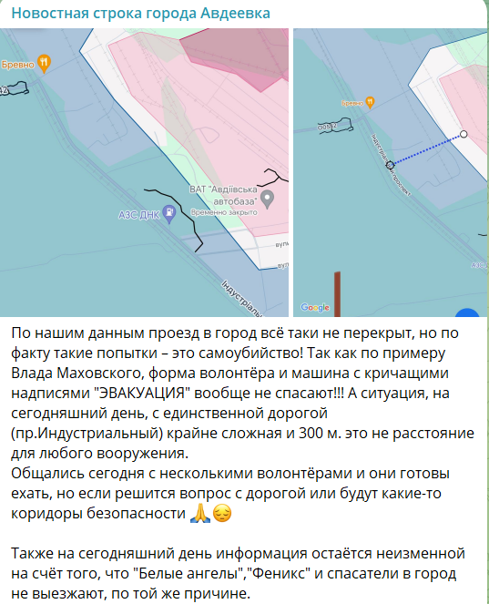 14:16 Местные паблики пишут, что проезд в Авдеевку пока официально не перекрыт, но фактически заблокирован, так как сейчас возможен через единственную дорогу, которая находится в 300 метрах от российских позиций и постоянно простреливается.