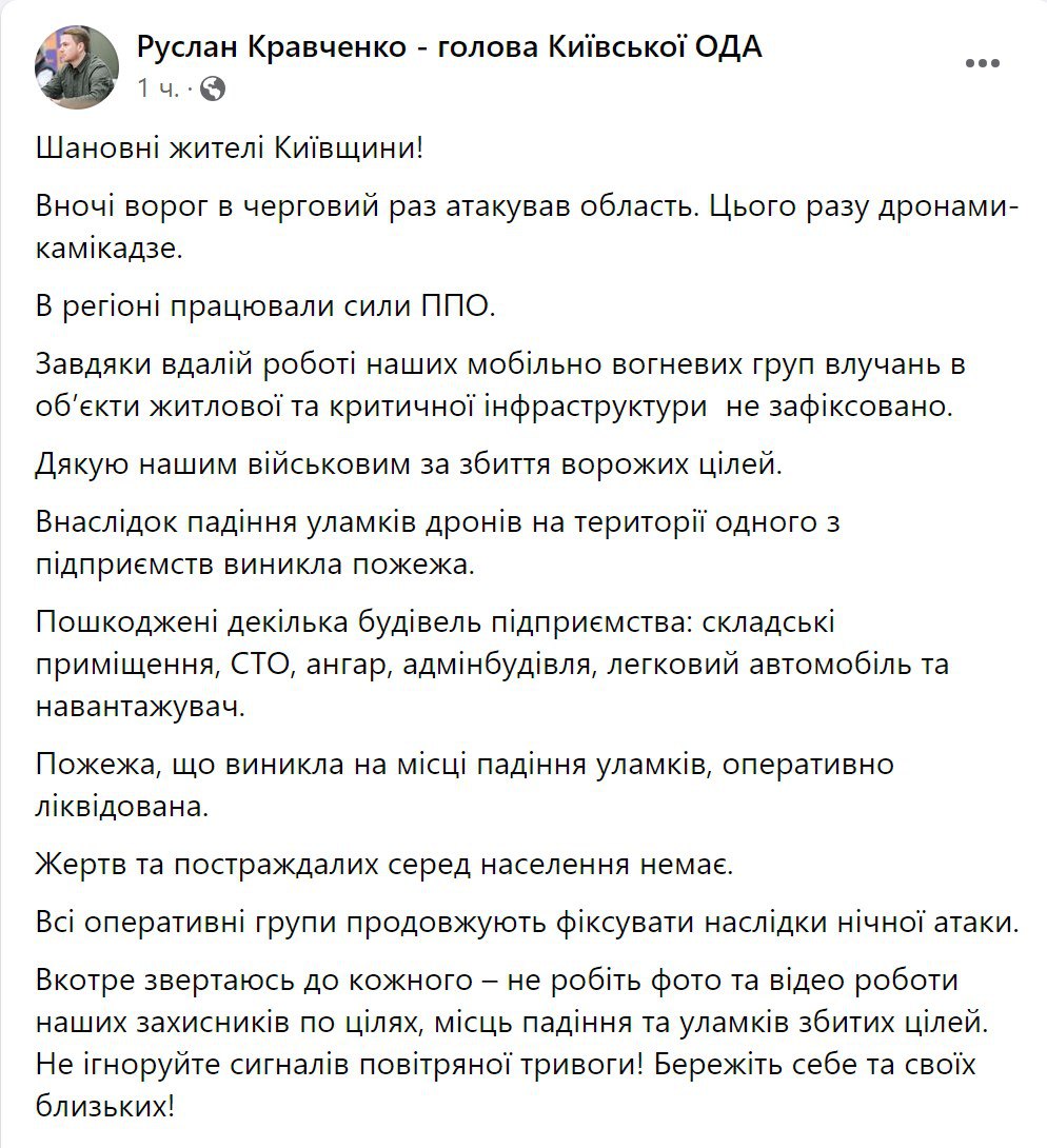 09:42 В Киевской области обломки дронов упали на территории одного из предприятий, возник пожар.