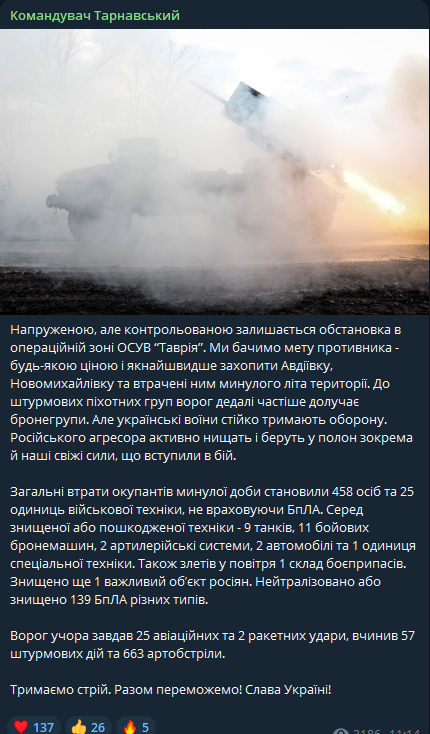 "Мы видим цель противника – любой ценой и как можно быстрее захватить Авдеевку, Новомихайловку и утраченные им прошлым летом территории. К штурмовым пехотным группам враг все чаще присоединяет бронегруппы. Но украинские воины стойко удерживают оборону. Российского агрессора активно уничтожают и берут в плен, в том числе и наши свежие силы, вступившие в бой", – написал генерал в Telegram.