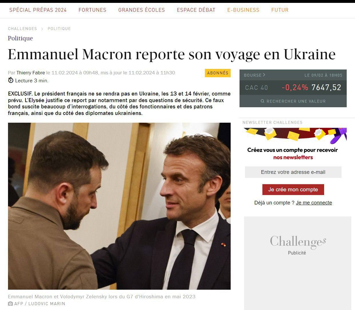 Сообщается, что запланированный визит в Украину 13 и 14 февраля, перенесен. Ожидалось, что в ходе визита Макрон может объявить о подписании двустороннего соглашения по гарантиям безопасности.