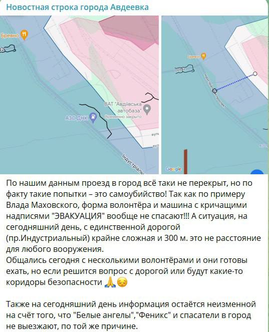Местные паблики пишут, что проезд в Авдеевку пока официально не перекрыт, но фактически заблокирован, так как сейчас возможен через единственную дорогу, которая находится в 300 метрах от российских позиций и постоянно простреливается.