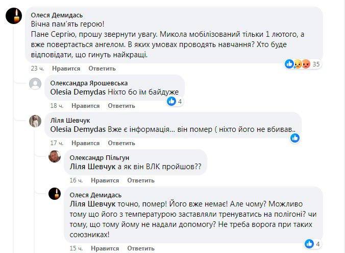 В комментариях под опубликованным мэром некрологом погибшего, которого звали Николай Ирзайкин, пользователи просят обратить внимание на то, что мужчину забрали в ВСУ чуть более чем за неделю до смерти. Также люди пишут, что Ирзайкина не убивали на фронте, а он умер, возможно из-за того, что его принуждали тренироваться на полигоне с температурой. Люди потребовали проверить, в каких условиях готовят мобилизованных.