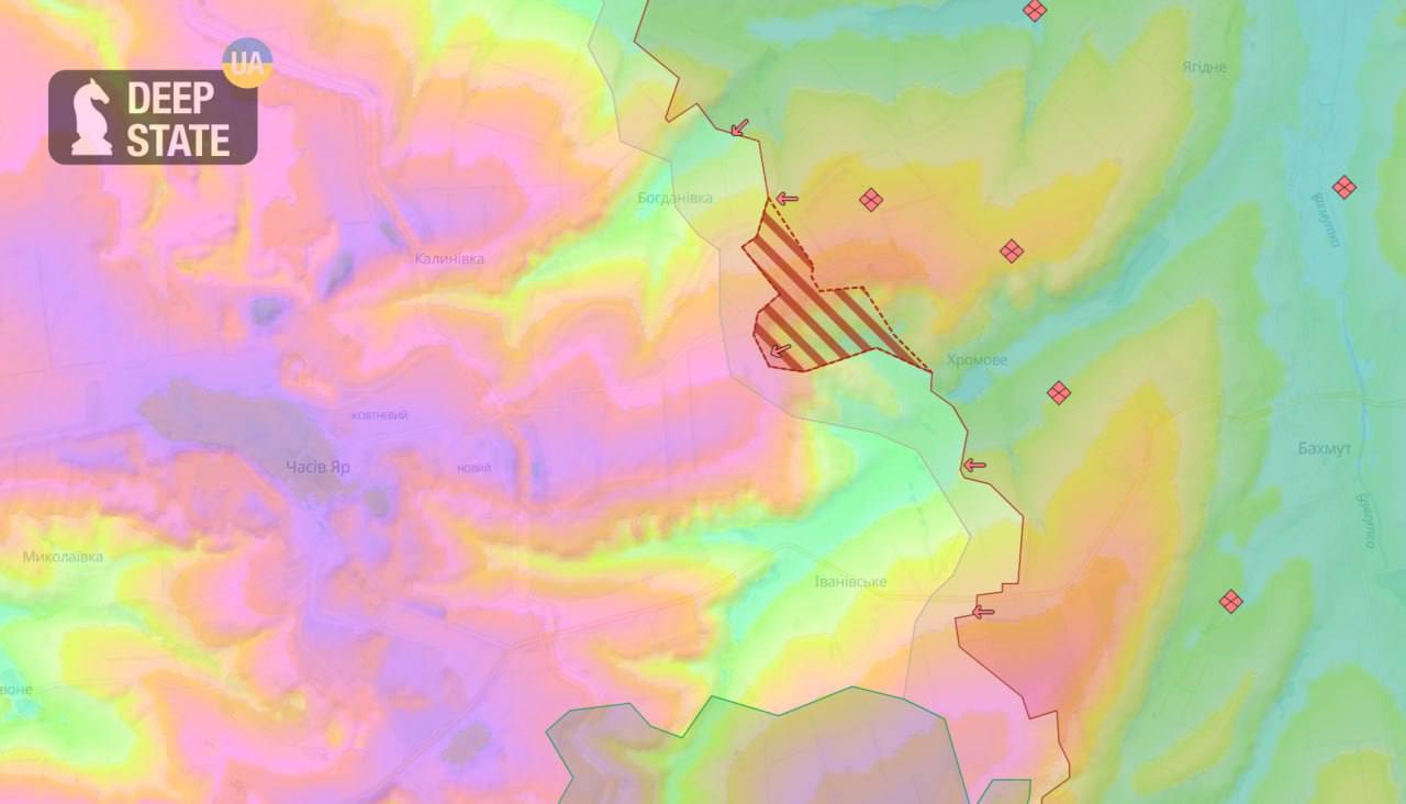 По данным паблика Deep State, россияне заняли лесной массив к югу от Богдановки, подобравшись вплотную к хребту, на котором располагается Часов Яр.
