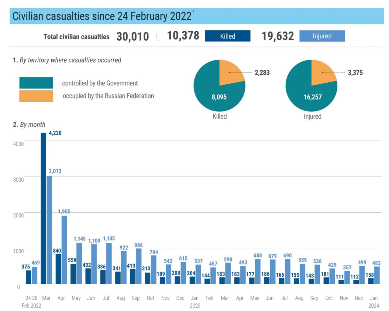 Большинство жертв среди гражданского населения (71%) по-прежнему происходят в контролируемых Украиной районах.
