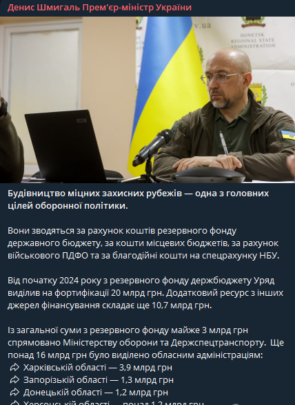 По данным премьера, с начала 2024 года из резервного фонда госбюджета правительство направило на фортификации в Украине 20 млрд грн, дополнительный ресурс из других источников финансирования составляет еще 10,7 млрд грн.
