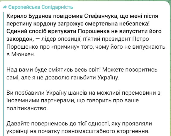 "Кирилл Буданов сообщил Стефанчуку, что мне после пересечения границы грозит смертельная опасность! Единственный способ спасти Порошенко – не выпустить его заграницу", – рассказал экс-президент.
