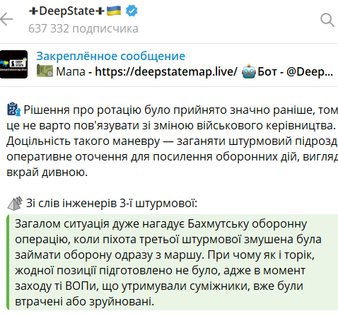 Также Deep State пишет, что из-за появления информации в СМИ о переброске 3-й ОШБр в Авдеевку до официального объявления увеличилось количество ракетных ударов по тыловым городам Донецкой области, где, по мнению РФ, могла находиться "Тройка".