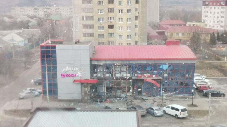 Накануне в городе была объявлена ракетная угроза. Судя по фото, пострадал ТЦ. Также пишут о прилете по стадиону.