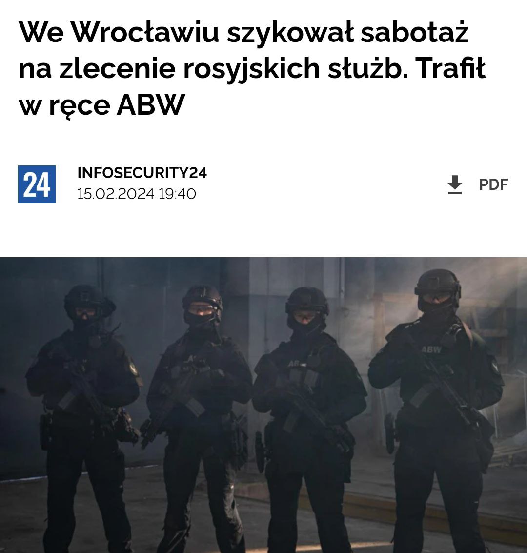 "Агентство внутренней безопасности получило информацию о том, что гражданин Украины, действуя по поручению российских спецслужб, планирует предпринять на территории Польши действия, направленные на поджоги объектов в городе Вроцлав, которые расположены в непосредственной близости от элементов стратегической инфраструктуры", - говорится в заявлении.