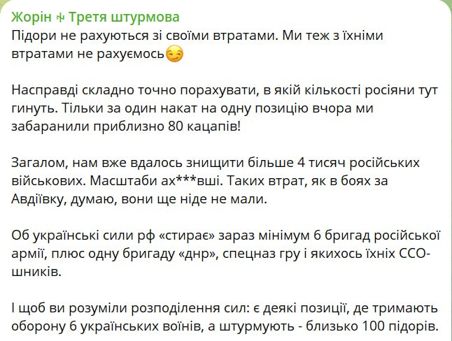 Об этом сообщил заместитель командира 3-й ОШБр ВСУ Максим Жорин в своем телеграм-канале.