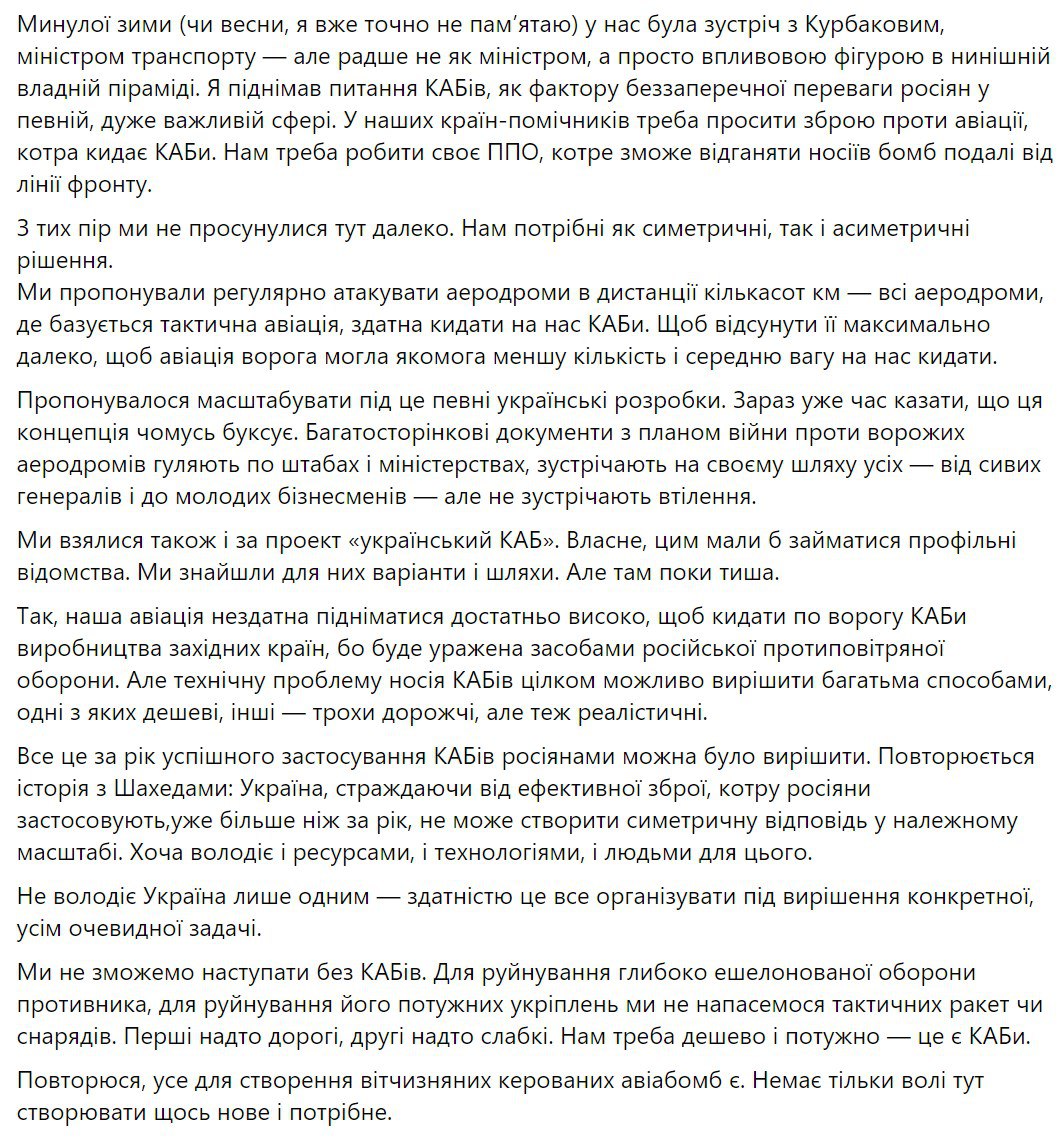 Луценко говорит, что КАБы гораздо дешевле ракет, обладая той же разрушительной силой и относительной точностью. Он также отмечает, что Украина не применяет западные аналогичные бомбы, поскольку ее авиация не может подниматься на нужную высоту.