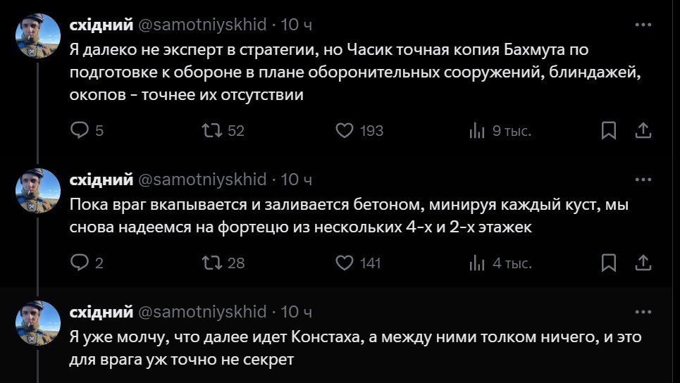 "Я далеко не эксперт в стратегии, но Часик точная копия Бахмута по подготовке к обороне в плане оборонительных сооружений, блиндажей, окопов - точнее их отсутствии. Пока враг вкапывается и заливается бетоном, минируя каждый куст, мы снова надеемся на фортецю из нескольких 4-х и 2-х этажек", - написал он.