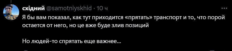 "Пару дней назад прямой наводкой сожгли очередной транспорт, благо за минуты до, всех кто был внутри - спустились в подвал", - добавил Східний, уточняя, что прятать транспорт от российских ударов с каждым днем становится все труднее.