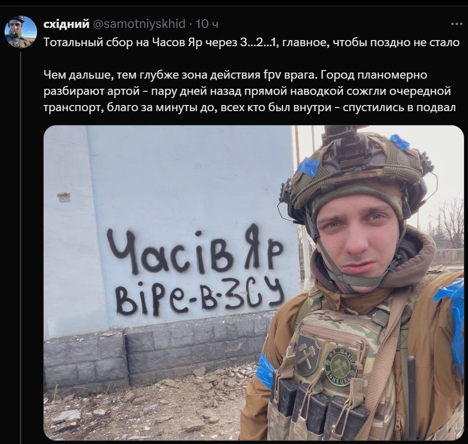 Украинский военный с позывным "Східний", воюющий в Часов Яре, заявляет, что город плохо укреплен перед угрозой наступления РФ.