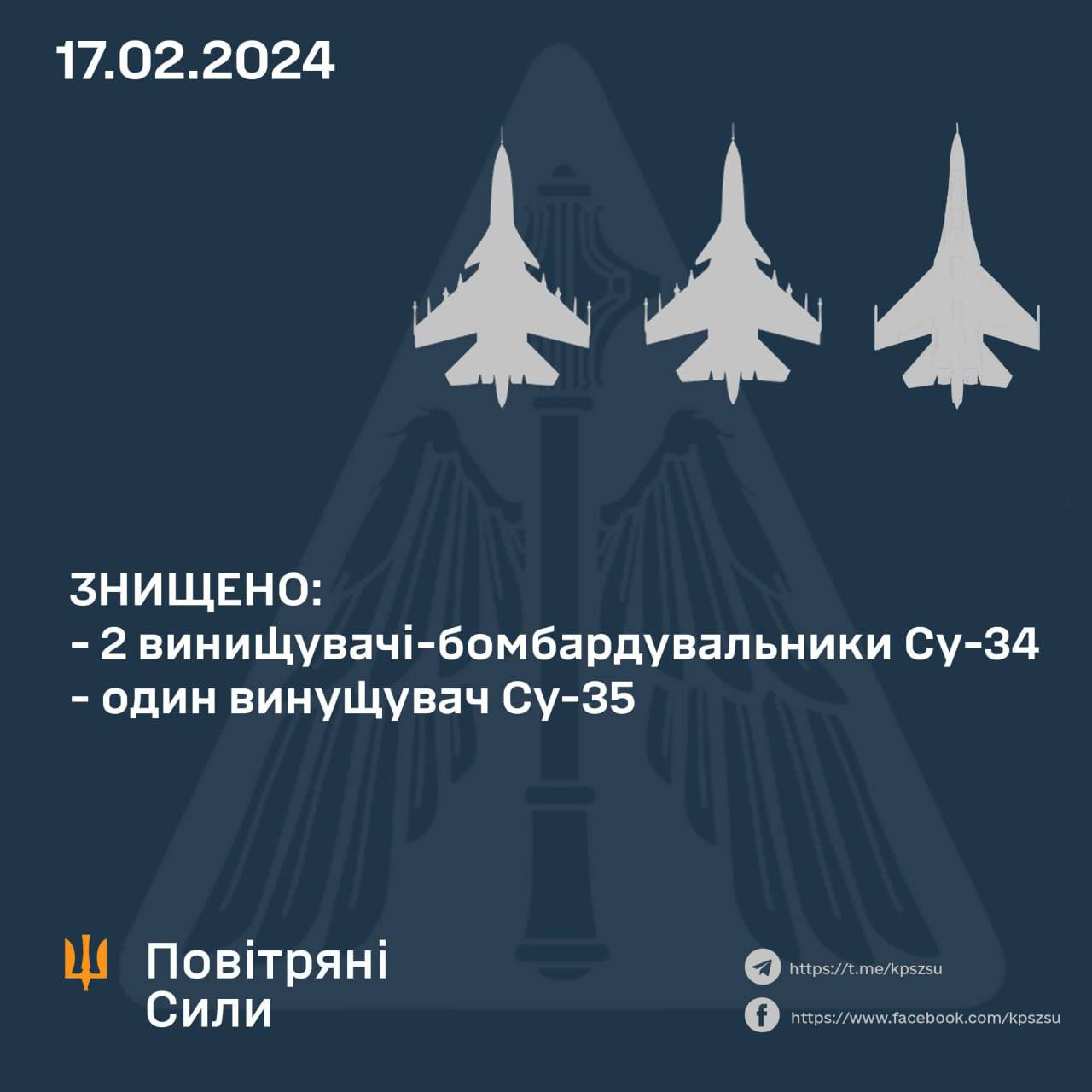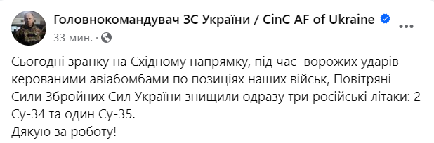 "На восточном направлении подразделениями Воздушных Сил Вооруженных Сил Украины уничтожены сразу три вражеских самолета – два истребителя-бомбардировщика Су-34 и один истребитель Су-35!", - написал он.