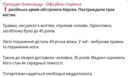 Об этом сообщает глава Херсонской ОВА Александр Прокудин.