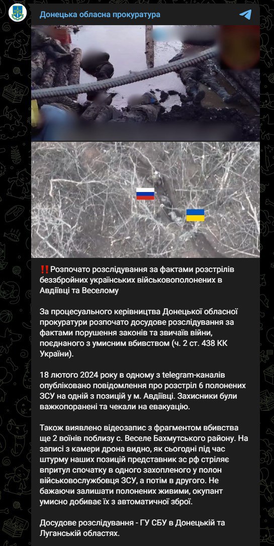"18 февраля 2024 года в одном из телеграм-каналов опубликовано сообщение о расстреле 6 пленных ВСУ на одной из позиций в г. Авдеевке. Защитники были тяжело ранены и ждали эвакуации", - говорится в сообщении прокуроров.