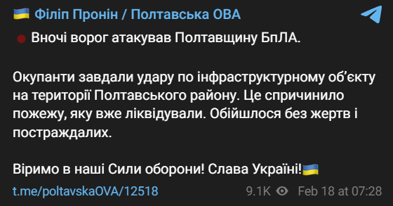 "Ночью враг атаковал Полтавскую область беспилотниками. Оккупанты нанесли удар по инфраструктурному объекту на территории Полтавского района", - написал он.