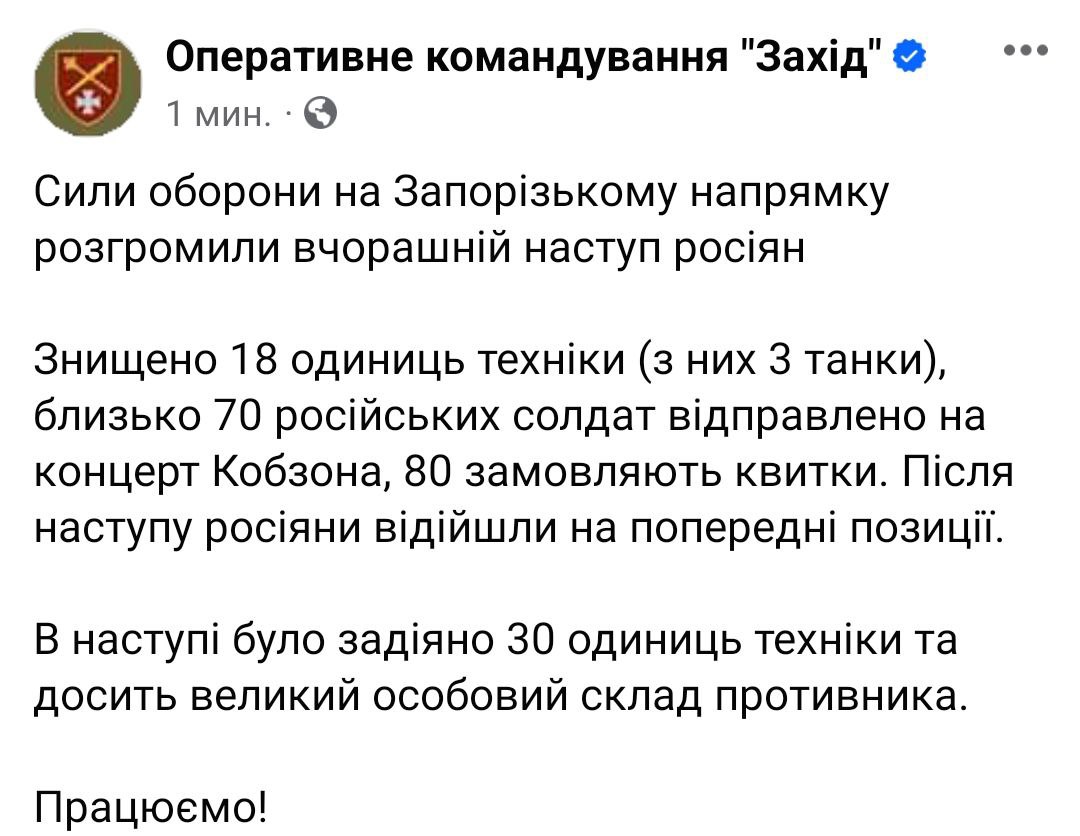 08:31 Оперативное командование "Запад" заявило об уничтожении 18 единиц российской техники, после чего войска РФ отошли на прежние позиции.