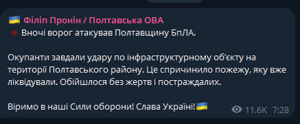 В ночь на 18 февраля российские военные атаковали Полтавскую область беспилотниками. Удар пришелся по инфраструктурному объекту области.