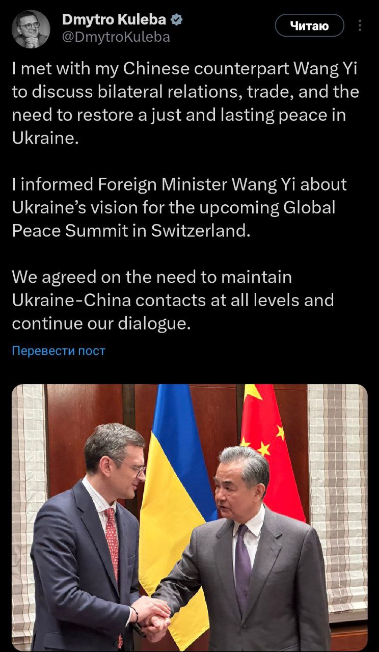 "Встретился с моим китайским коллегой Ван И, чтобы обсудить двусторонние отношения, торговлю и необходимость восстановления справедливого и крепкого мира в Украине. Я проинформировал министра иностранных дел Ван И о видении Украины о предстоящем саммите глобального мира в Швейцарии", - рассказал Кулеба.