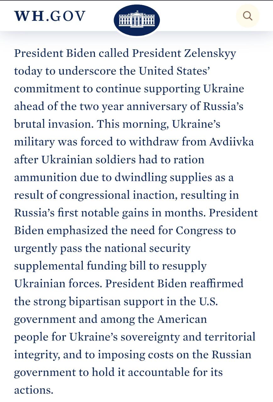 Напомним, Палата представителей ушла в отпуск до конца февраля. Reuters пишет, что Конгресс вернется к вопросу о помощи Украине не ранее середины марта.