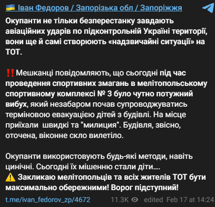 "Жители сообщают, что сегодня во время проведения спортивных соревнований в мелитопольском спортивном комплексе № 3 был слышен мощный взрыв, который вскоре начал сопровождаться срочной эвакуацией детей из здания. На место приехали скорые и "милиция". Здание, конечно, окружено, оконное стекло вылетело", – пишет Федоров.