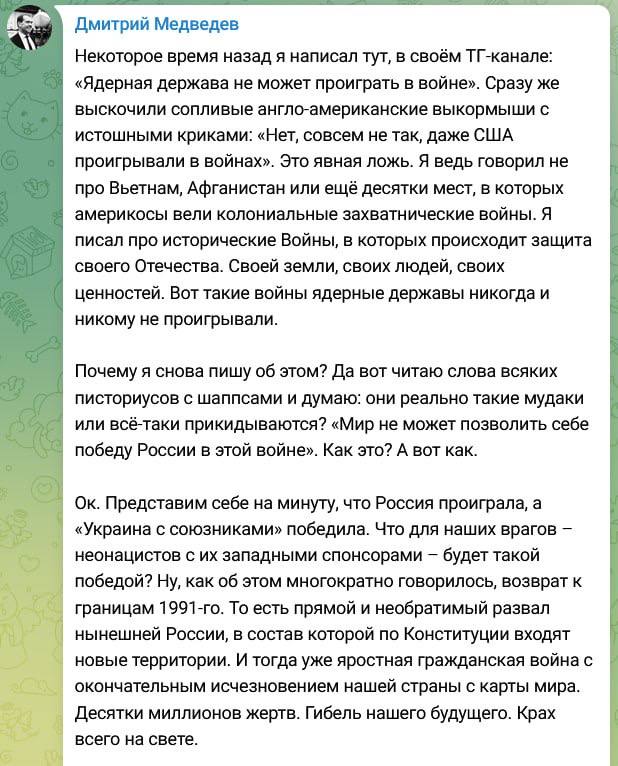 Напомним, в прошлый раз Медведев угрожал Украине ядерным ударом в случае атаки по территории РФ западным оружием.