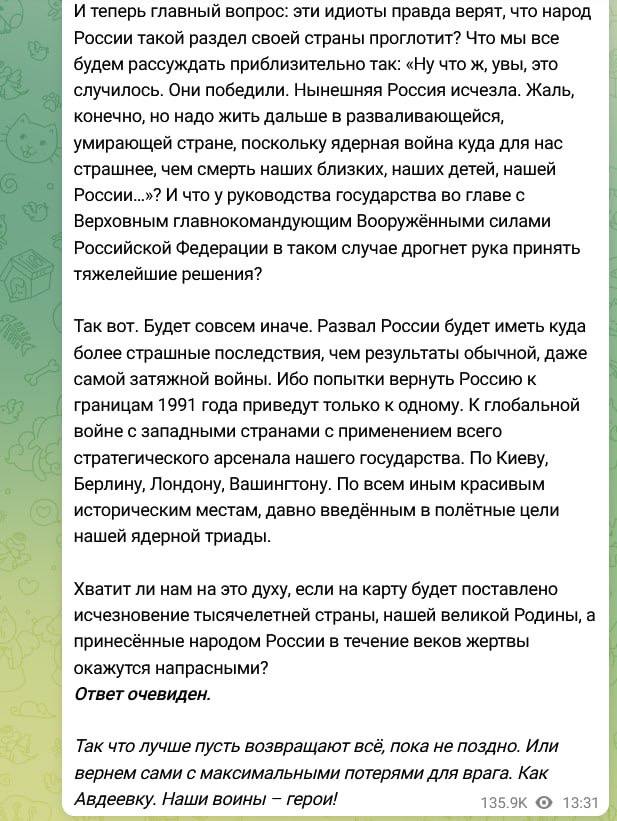 "Злой" пугает Украину и Запад ядерной войной в случае достижения официальной цели Киева - выхода на границы 1991 года. А "добрый" предлагает договариваться по той линии фронта, что есть сейчас", - комментирует ситуацию телеграм-канал "Политика Страны".