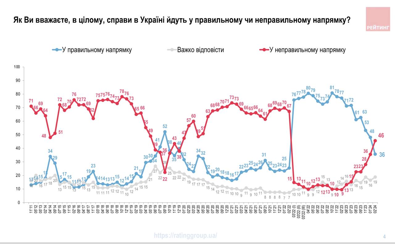 Неправильным направление движения страны в феврале считает 46%, правильным - 36% (остальные не определились), в то время как в январе эти цифры составляли 48% и 36% в пользу "правильного направления".