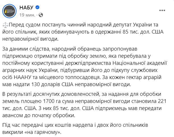 Напомним, НАБУ опубликовало запись нардепа Гунько, где он обсуждает коррупционные тарифы за передачу земли в пользование некому бизнесмену. Гунько в видео говорит, что такса его и силовиков в этих схемах составляет 130-150 долларов за гектар.