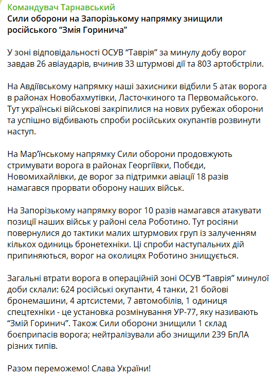 Накануне Силы обороны сообщили, что украинские войска отбили наступление россиян на Запорожском направлении.