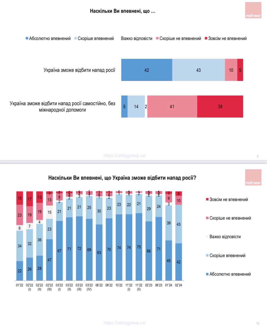 Еще 43% заявляют, что они "скорее уверены" в этом. Месяц назад эти цифры составляли соответственно 45% и 39%, а в октябре 2022-го - 74% и 22%.