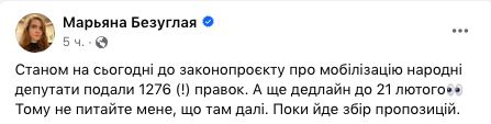 В свою очередь нардеп Алексей Гончаренко прогнозировал, что рассмотрение законопроекта о мобилизации состоится в начале марта.