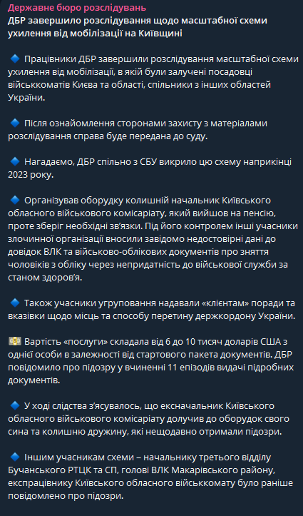 "Организовал схему бывший начальник Киевского областного военкомата, вышедший на пенсию, но сохранивший связи. Под его контролем другие участники преступной организации вносили заведомо недостоверные данные в справки ВЛК и военно-учетные документы о снятии мужчин с учета из-за непригодности к военной службе по состоянию здоровья" - говорится в сообщении.