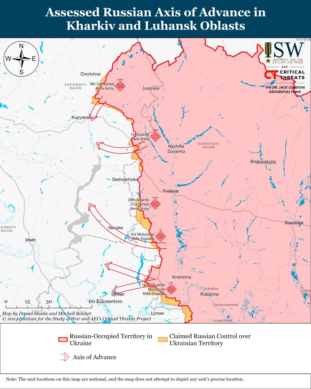 "Нынешнее российское наступление на харьковско-луганском направлении, напротив, включает атаки по четырем параллельным направлениям, которые взаимно поддерживают друг друга и преследуют множество целей. В совокупности они, вероятно, принесут значимые в оперативном отношении выгоды", - считает ISW.